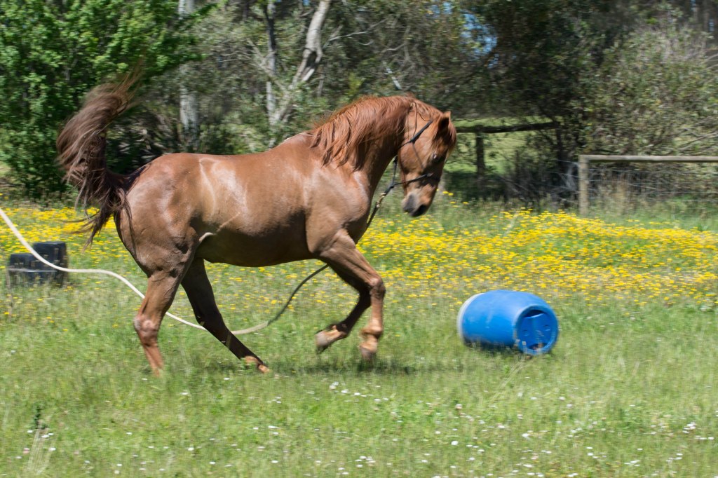 Five years earlier, we had seen an American horseman at Equitana – a large horse expo in Melbourne. He rode into the arena, bareback and bridle-less, at a full gallop, and came to a slide stop simply by breathing out. His horse was amazing. He brought a team of trainees. There were about fifteen people running around the arena with their horses. No ropes, just each person with their horse sticking by them. We bought his book and tried to figure it out with our daughter’s Thoroughbred horse. We had no idea what we were doing. A few years later, her horse died tragically, and that was the end of that.